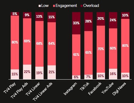 TV4 a également examiné les niveaux d’engagement grâce aux capteurs EDR, révélant que les téléspectateurs ont connu un niveau de surcharge sensorielle plus élevé lorsqu’ils interagissaient avec les publicités sur les réseaux sociaux, ce qui a eu un impact négatif sur la rétention de la mémoire. Bien que les niveaux d’engagement pour les médias sociaux se situent entre 60% et 70%, la surcharge était considérablement plus élevée que pour TV4 Play et la télévision linéaire. Dans l’ensemble, TV4 Play a généré cinq fois plus d’engagement publicitaire par minute que les plateformes sociales.